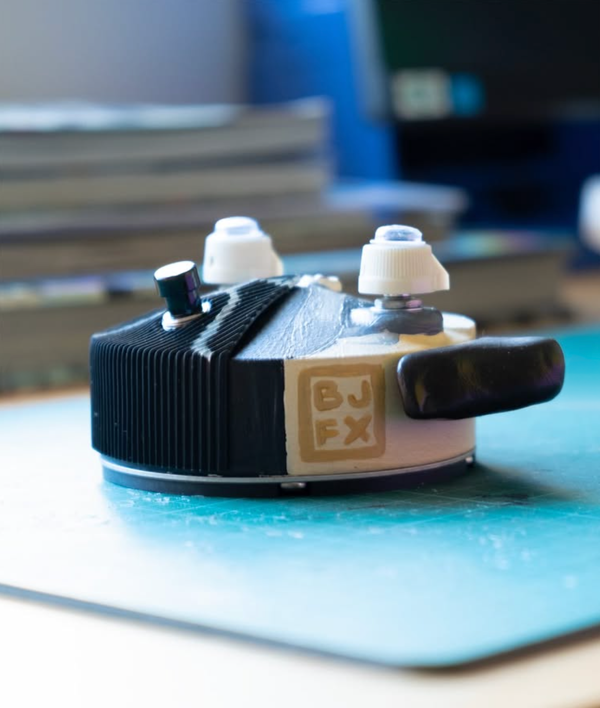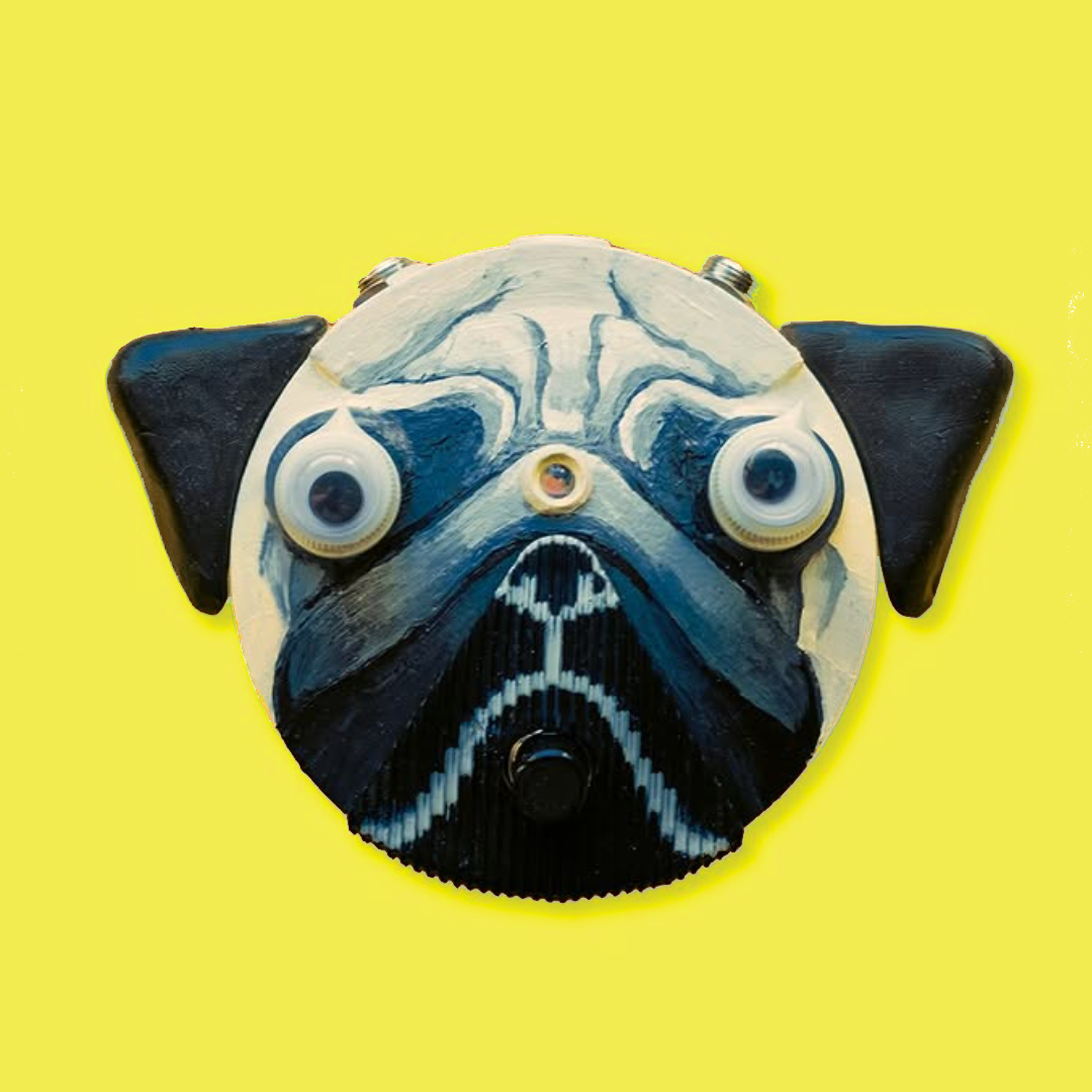 Furry lil Fuzz - A friend of mine and I got to talking about repairing his old Dunlop mini FuzzFace that had long had its volume control broken. During this conversation someone mentioned ‘ha that pedal looks like a pug kinda’. What followed was a wave of enthusiasm that led us to the gameplan. Design a Fuzz Face based circuit, build the effect in the old enclosure and repaint it to look like my friend’s pet pug. What results is the PugFace. A Darlington-based FuzzFace, that not only sounds great but is goofy, stupid but cute.